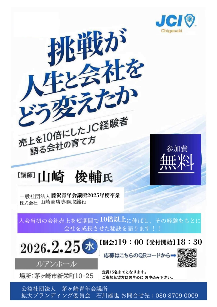2026年02月25日(水)ルアンホールにて、公益社団法人茅ヶ崎青年会議所2026年度2月例会『山崎 俊輔氏講演~会社の売り上げが10倍になった秘訣』と題した講演事業を開催します。